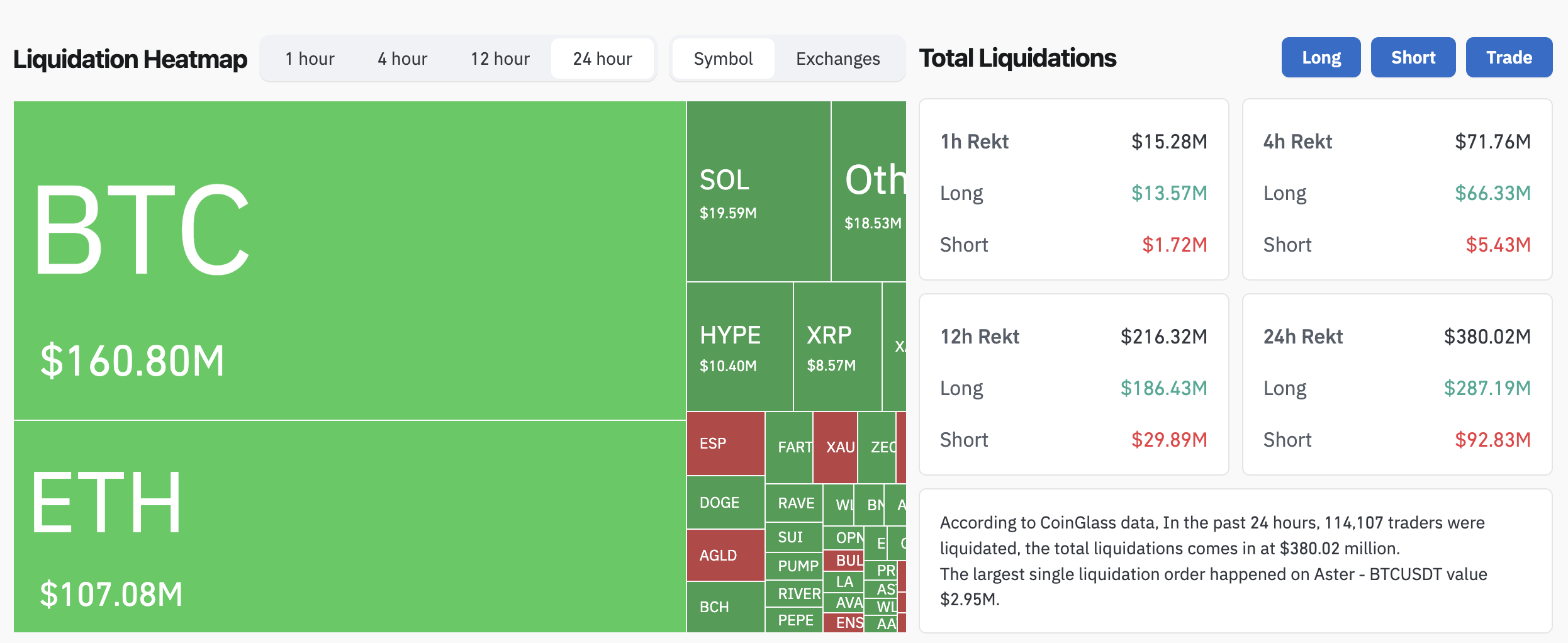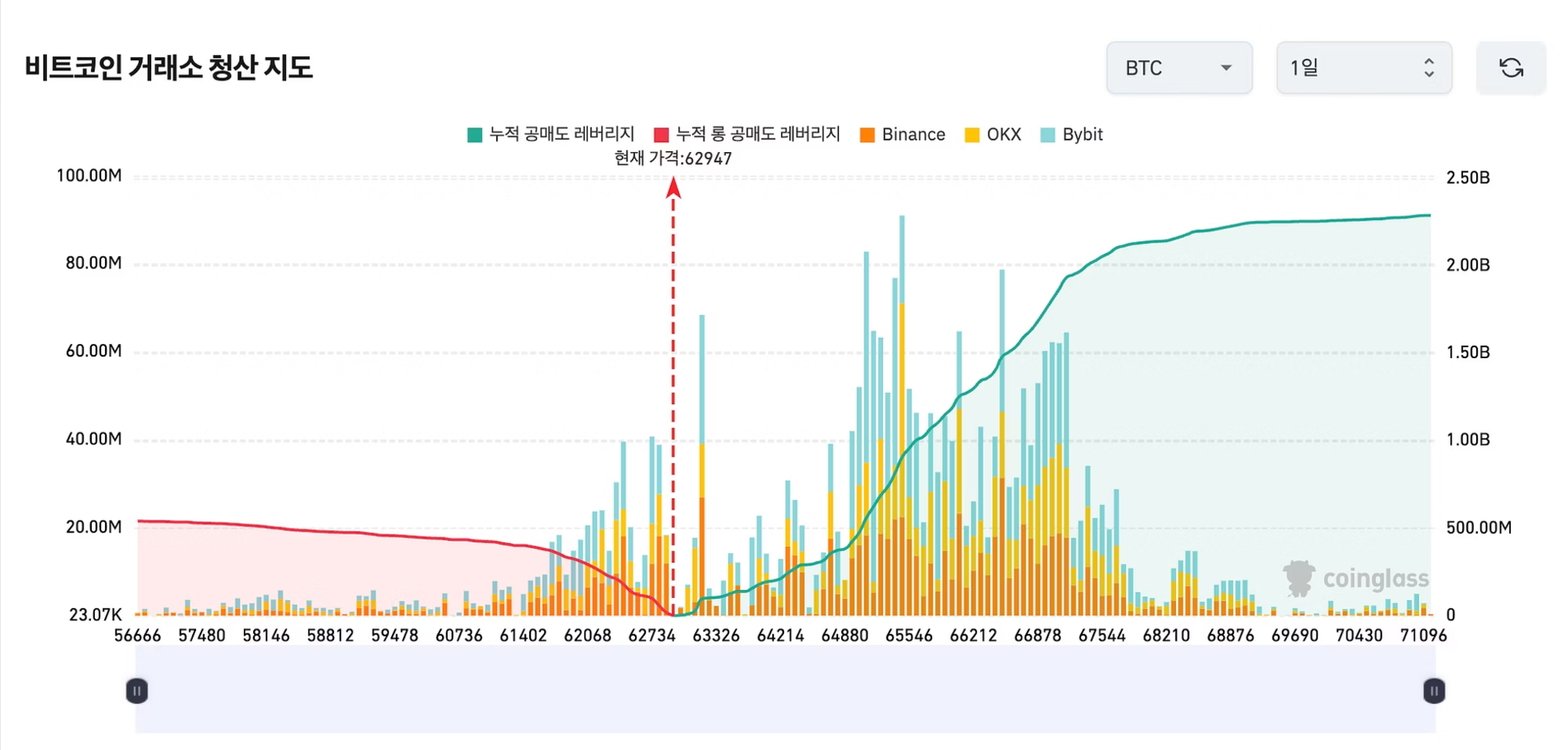 전체 청산 3억 2,900만 달러 중 롱 청산이 2억 3,500만 달러, 숏 청산이 9,390만 달러였습니다. 롱이 전체의 71%를 차지한 셈입니다.