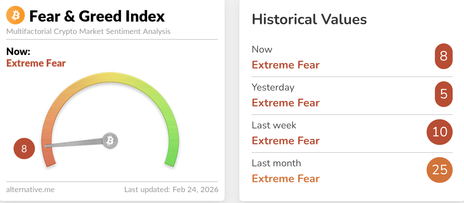 공포·탐욕 지수가 8이라는 건 '극단적 공포' 구간입니다. RSI 39.14는 '과매도' 영역이고요. 이 두 지표를 보고 "이제 반등이다"라고 단정하는 건 위험합니다. 극단적 공포는 반등의 '필요조건'이 될 수 있지만 '충분조건'은 아닙니다.