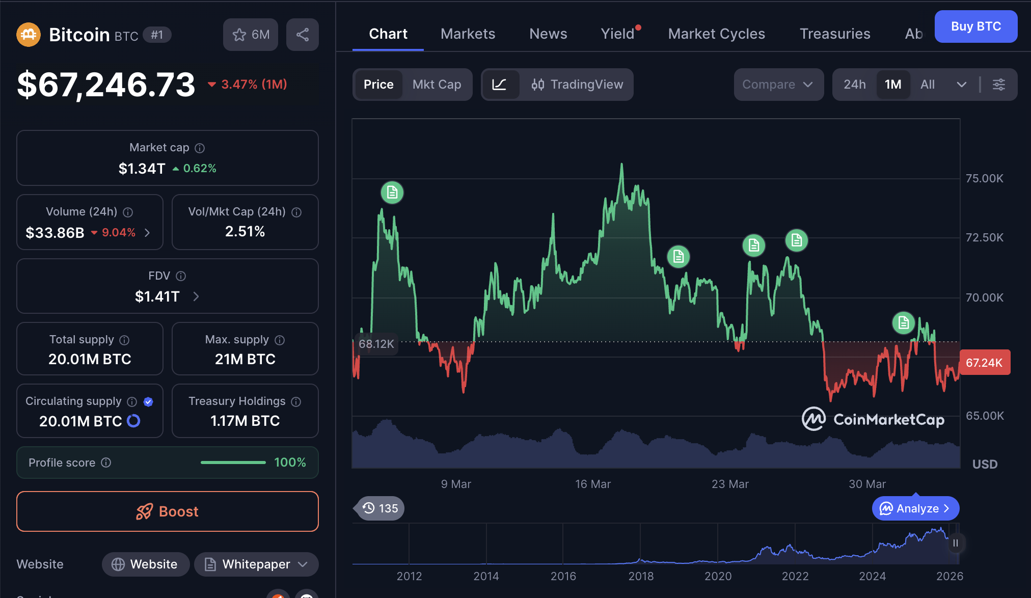BeInCrypto's April analysis identifies $67,000 as Bitcoin's most critical technical level. Throughout 2026, this level has functioned as a key support, with every dip below it being quickly reclaimed. However, with ETF and whale data weakening, a clean breakdown below $67,000 opens the path to $61,500 (the 0.382 Fibonacci level), followed by $60,000 as a psychological and technical floor.