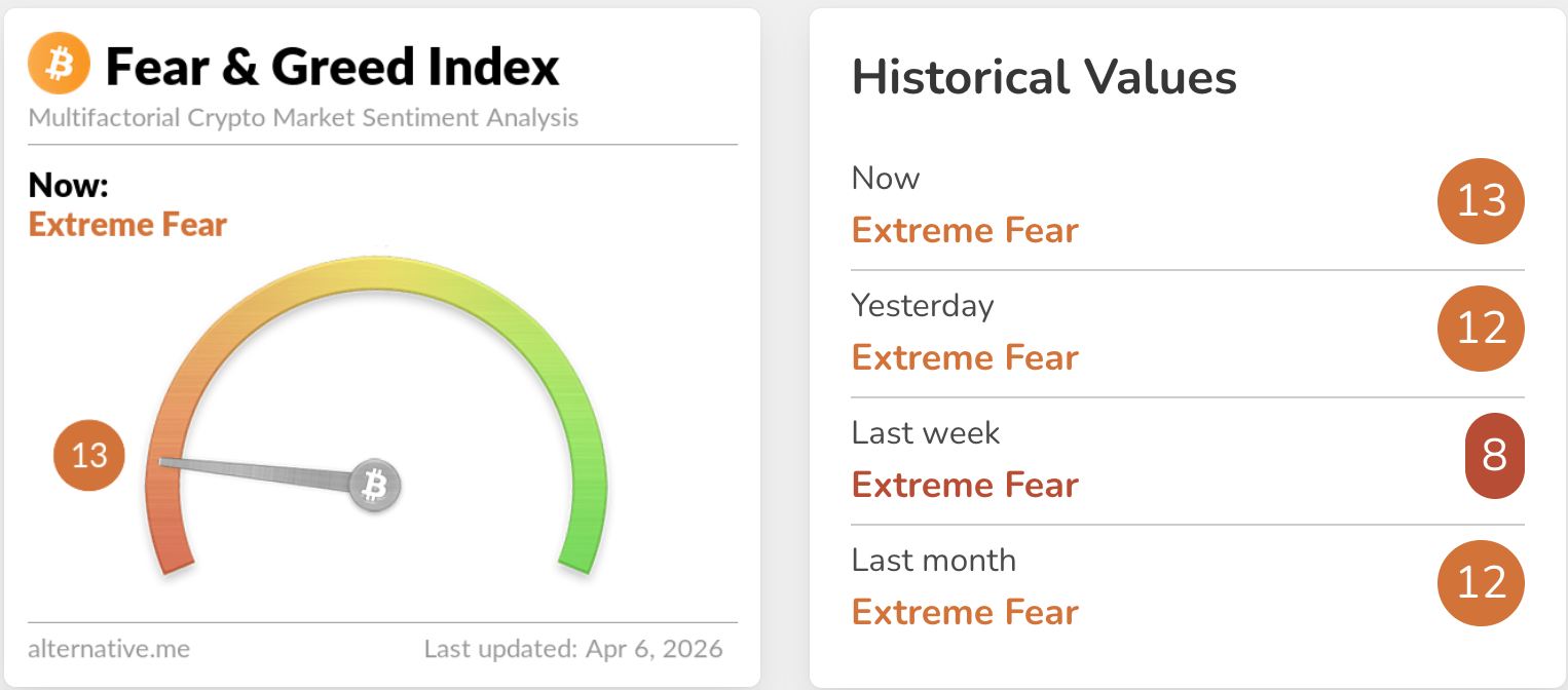 | Sentiment | Crypto Fear & Greed Index | 13 — Extreme Fear |