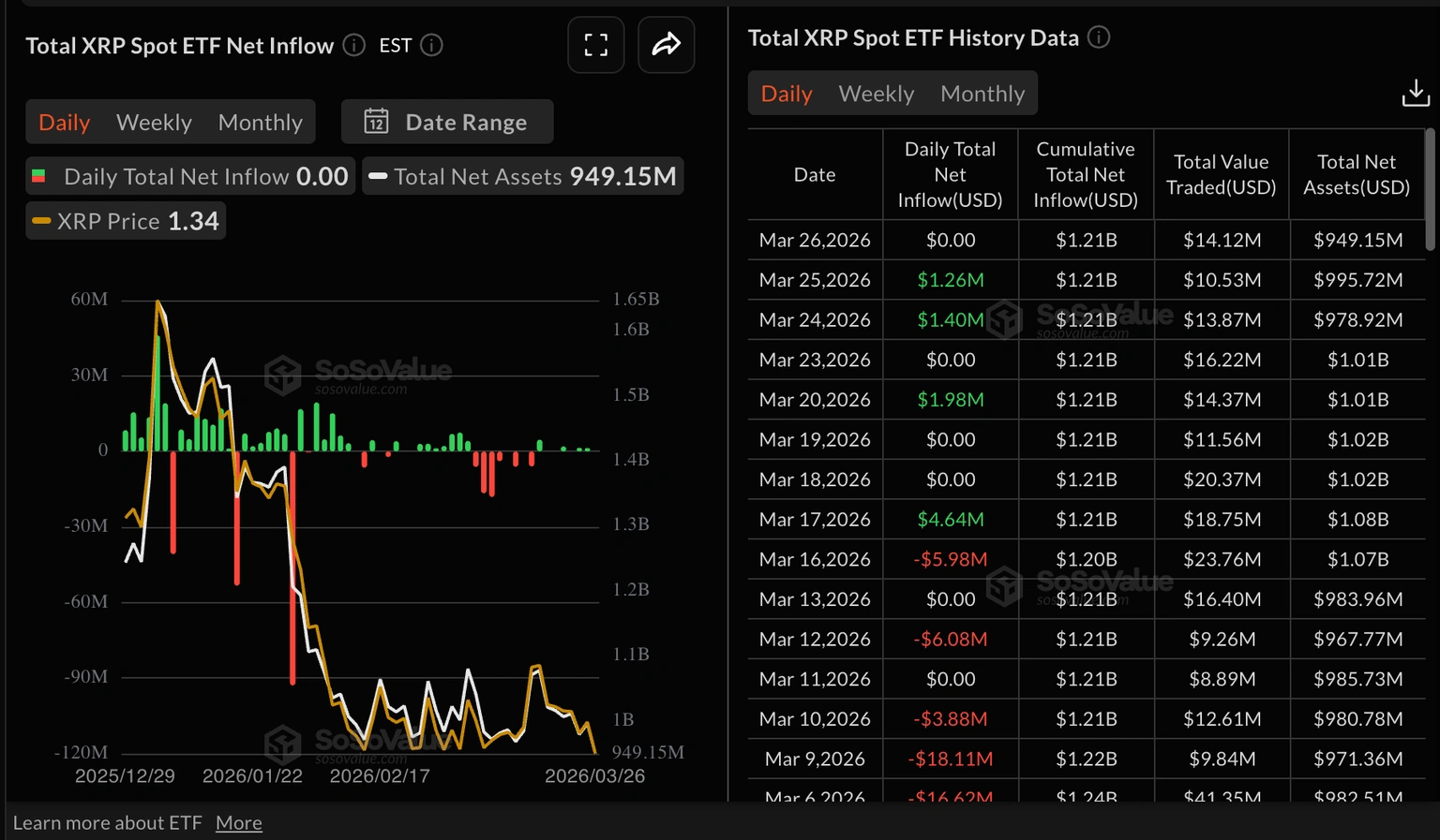 | XRP ETF | Net asset value | ~$1.65B (Jan) → ~$949M (current) |