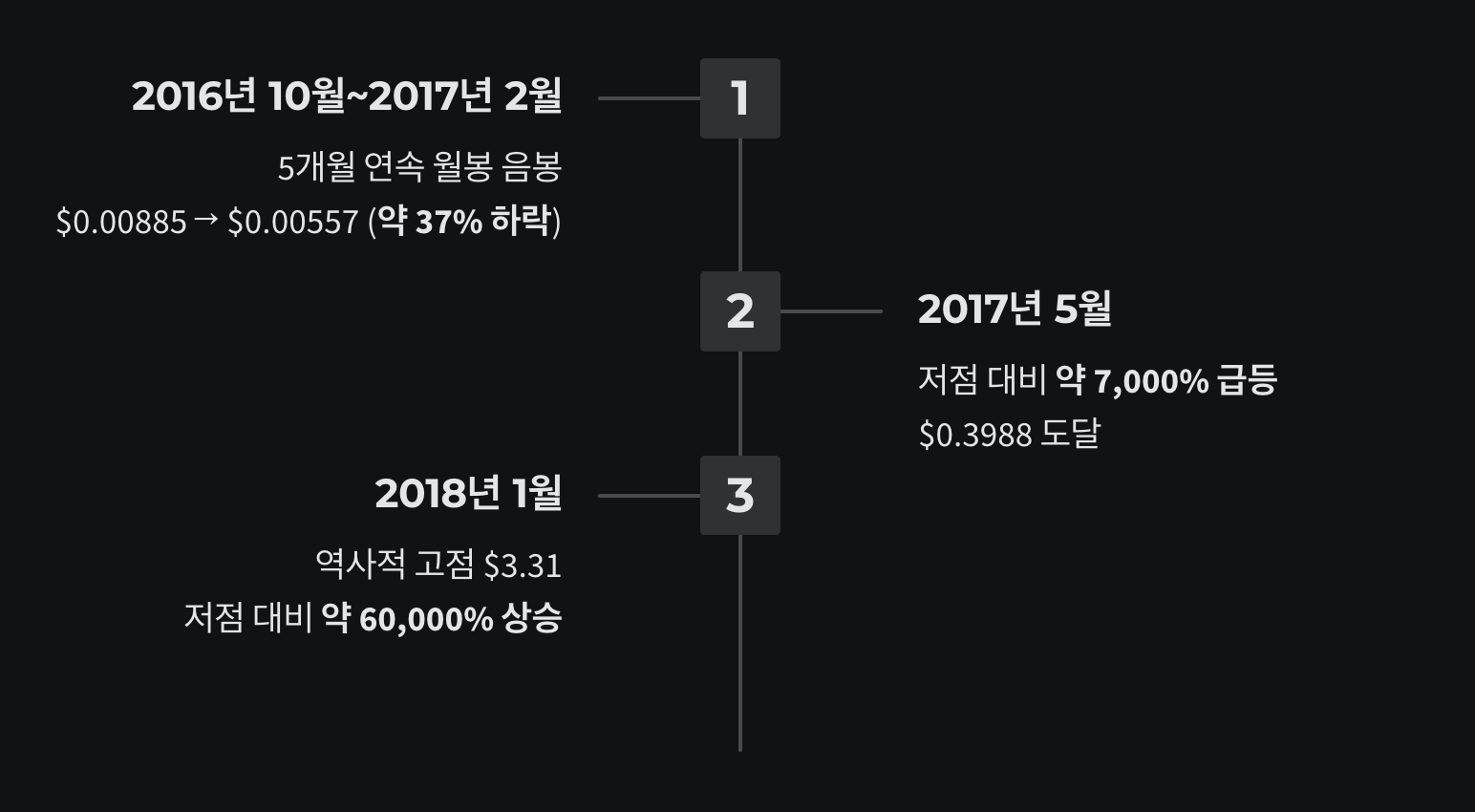 NewsBTC 보도에 따르면, XRP는 2016년 10월부터 2017년 2월까지 5개월 연속 월봉 음봉을 기록했다. 이 기간 가격은 $0.00885에서 $0.00557로, 약 37% 하락했다. 이후 2017년 3월 저점을 형성한 뒤, 두 달 만인 2017년 5월에 $0.3988까지 약 7,000% 급등했고, 2018년 1월에는 $3.31까지 올라 저점 대비 약 60,000%라는 기록을 남겼다.