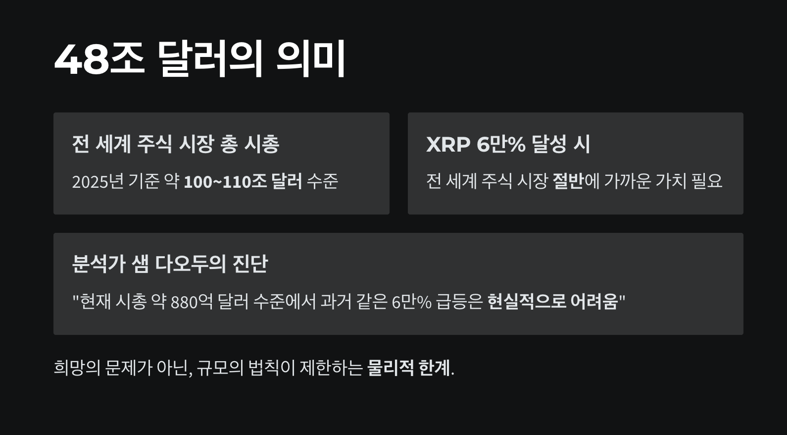 CoinGecko 기준 현재 XRP의 유통량은 약 610억 개, 시가총액은 약 800억 달러대다. 6만%는 약 600배를 의미하므로, 시총은 약 48조 달러가 된다. 2025년 기준 전 세계 주식 시장 총 시가총액이 약 100~110조 달러 범위이므로, XRP 하나가 글로벌 주식 시장의 절반에 가까운 가치를 가져야 한다.