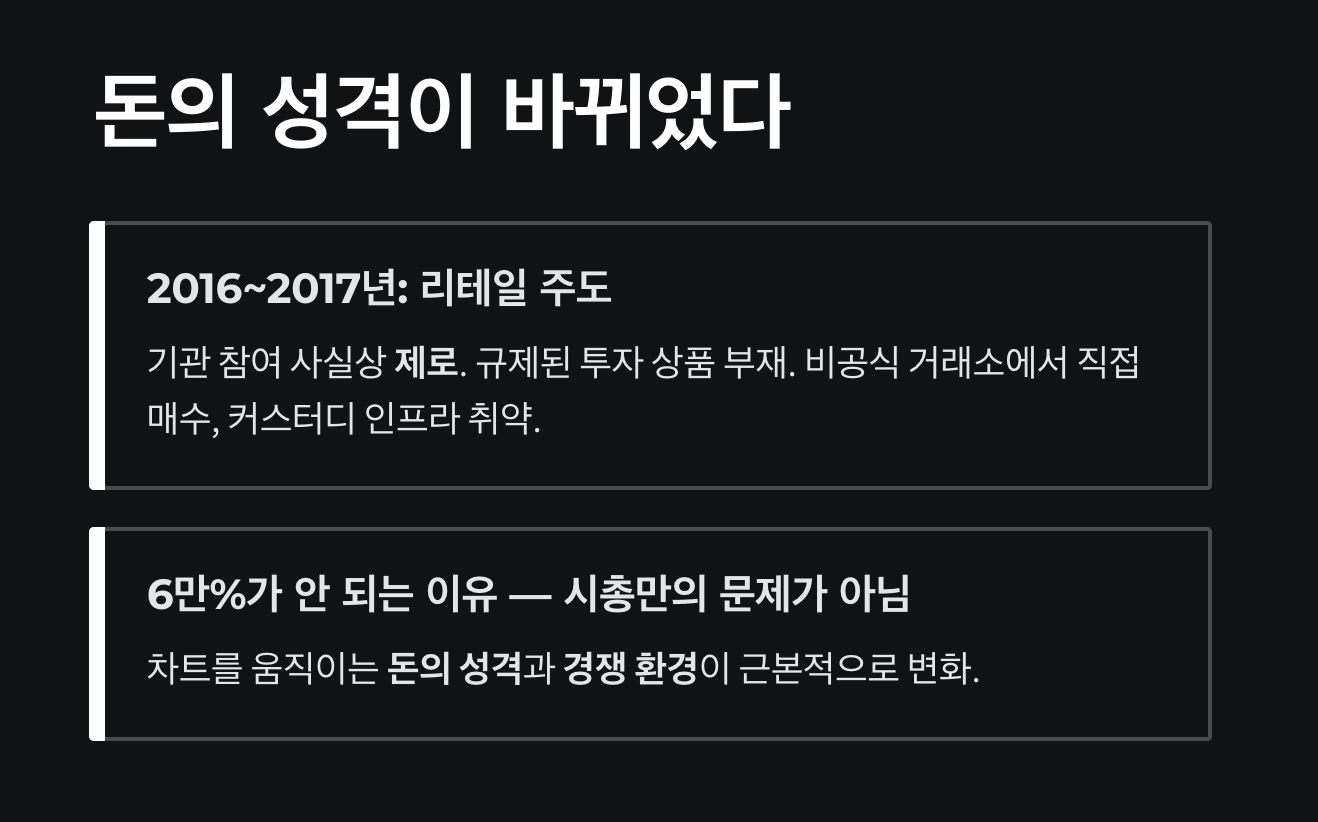 이건 비관론이 아니라 산수다. 시총이 수억 달러였던 2016년과 수백억 달러인 2026년에서 같은 배율의 상승이 가능하려면, 유입돼야 하는 자금의 절대량이 수백 배 차이가 난다. 2017년의 초대형 퍼센트는 시장이 작고 유동성이 얕을수록 더 쉽게 발생하는, 일종의 '규모의 착시'였다.