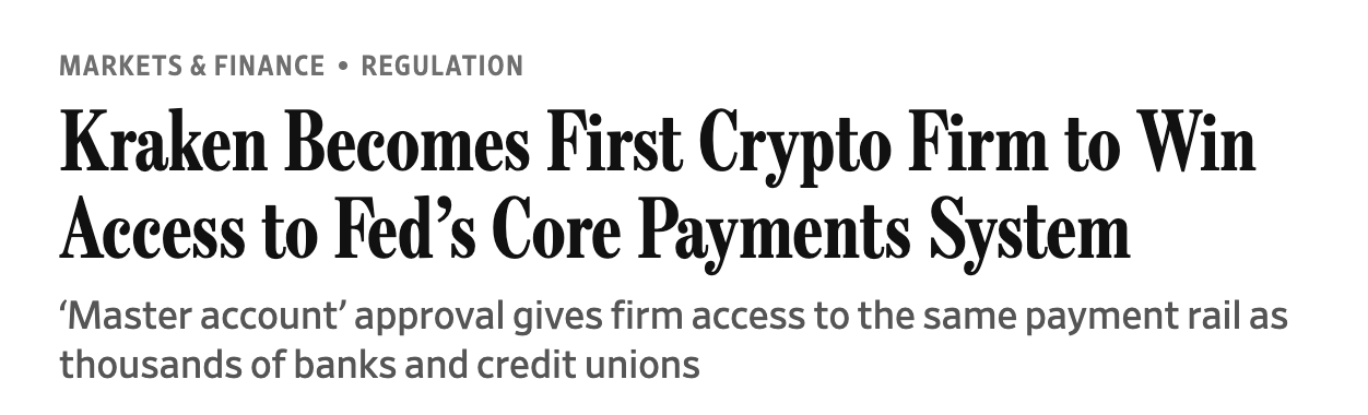미국 연방준비제도(Fed)의 핵심 결제 시스템에 접근할 수 있는 이른바 마스터 계정(master account)을 크라켄의 뱅킹 부문이 승인받았다는 보도가 나왔다. 크립토 기업으로는 역사상 최초다. (WSJ, Reuters, FT)