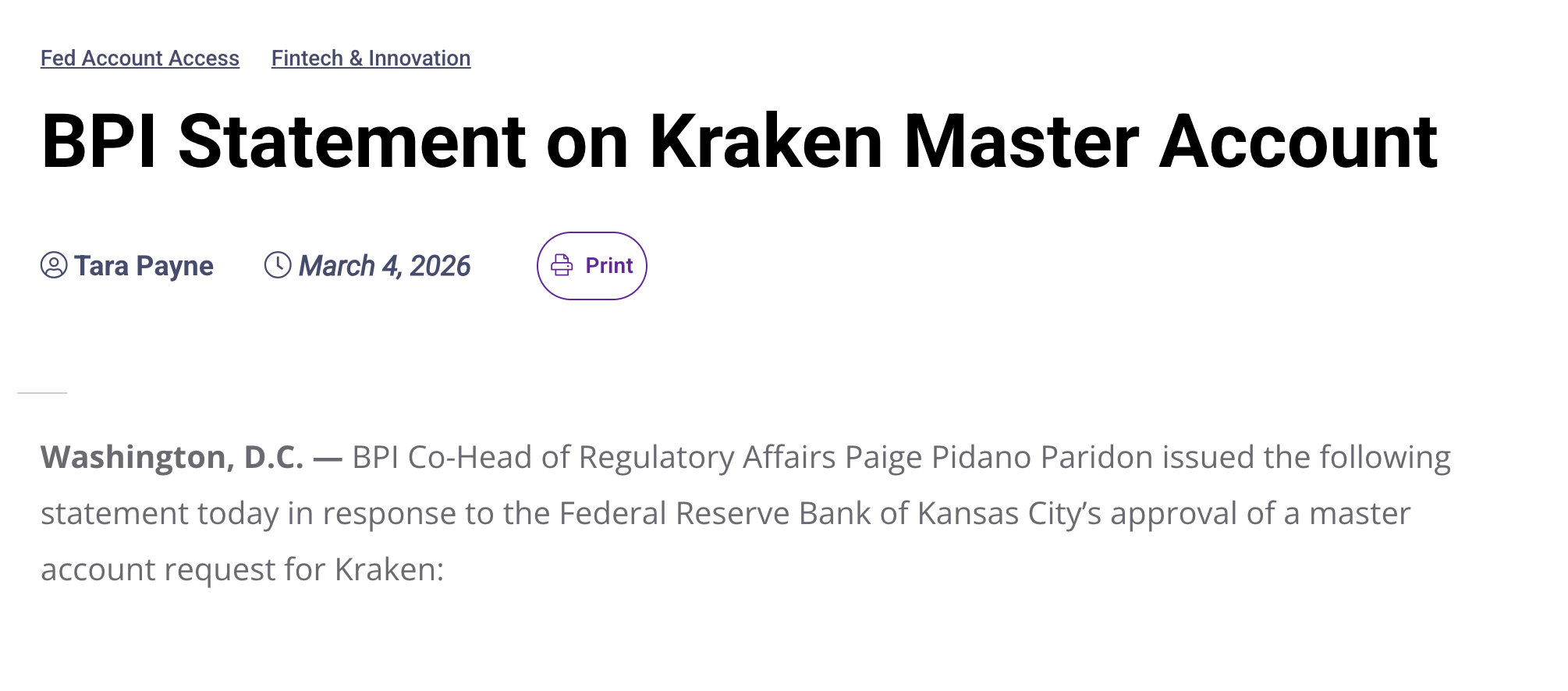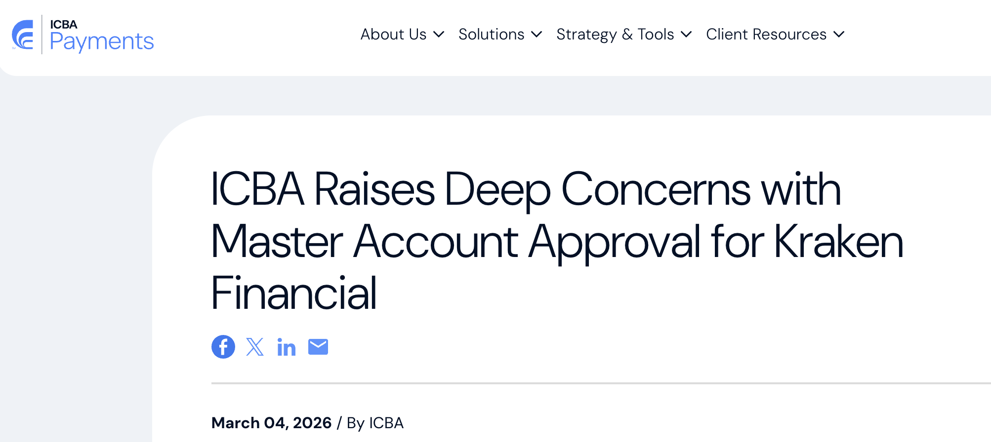 | 5 | ICBA — Deep concerns with Kraken approval | https://www.icba.org/web/payments/w/icba-raises-deep-concerns-with-master-account-approval-for-kraken-financial |