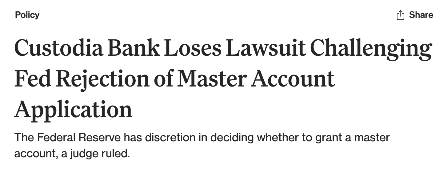 | 15 | CoinDesk — Custodia loses lawsuit | https://www.coindesk.com/policy/2024/03/29/custodia-bank-loses-lawsuit-challenging-fed-rejection-of-master-account-application |