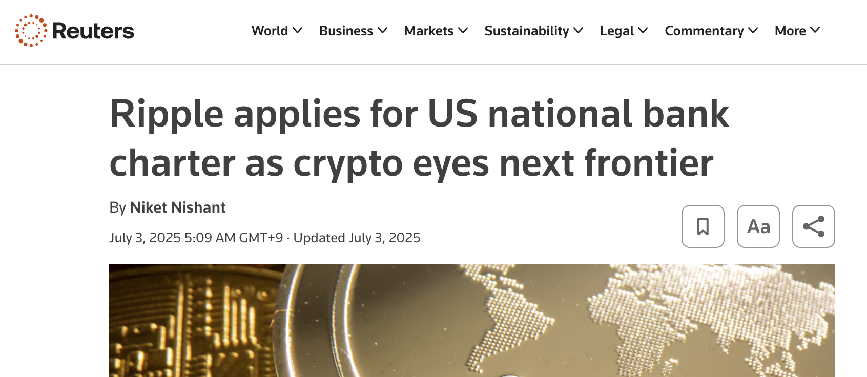 | 12 | Reuters — Ripple applies for bank charter | https://www.reuters.com/business/finance/ripple-applies-us-national-bank-charter-crypto-eyes-next-frontier-2025-07-02/ |