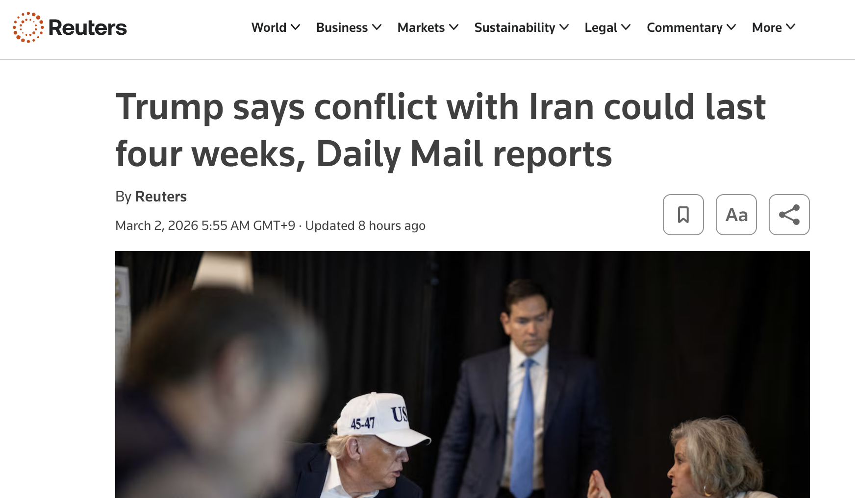 - Reuters — Trump says conflict could last four weeks