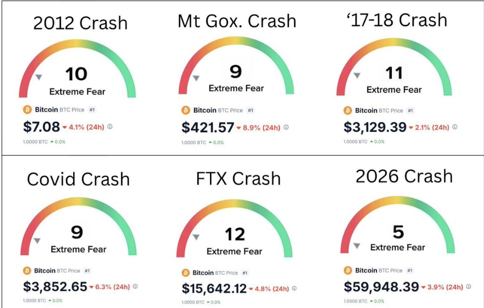 그러나 현재 수치의 맥락은 짚어둘 가치가 있다. 분석가 마이클 반 데 포프(Michaël van de Poppe)가 비트코인 주요 폭락기의 공포·탐욕 지수를 비교한 결과는 다음과 같다.