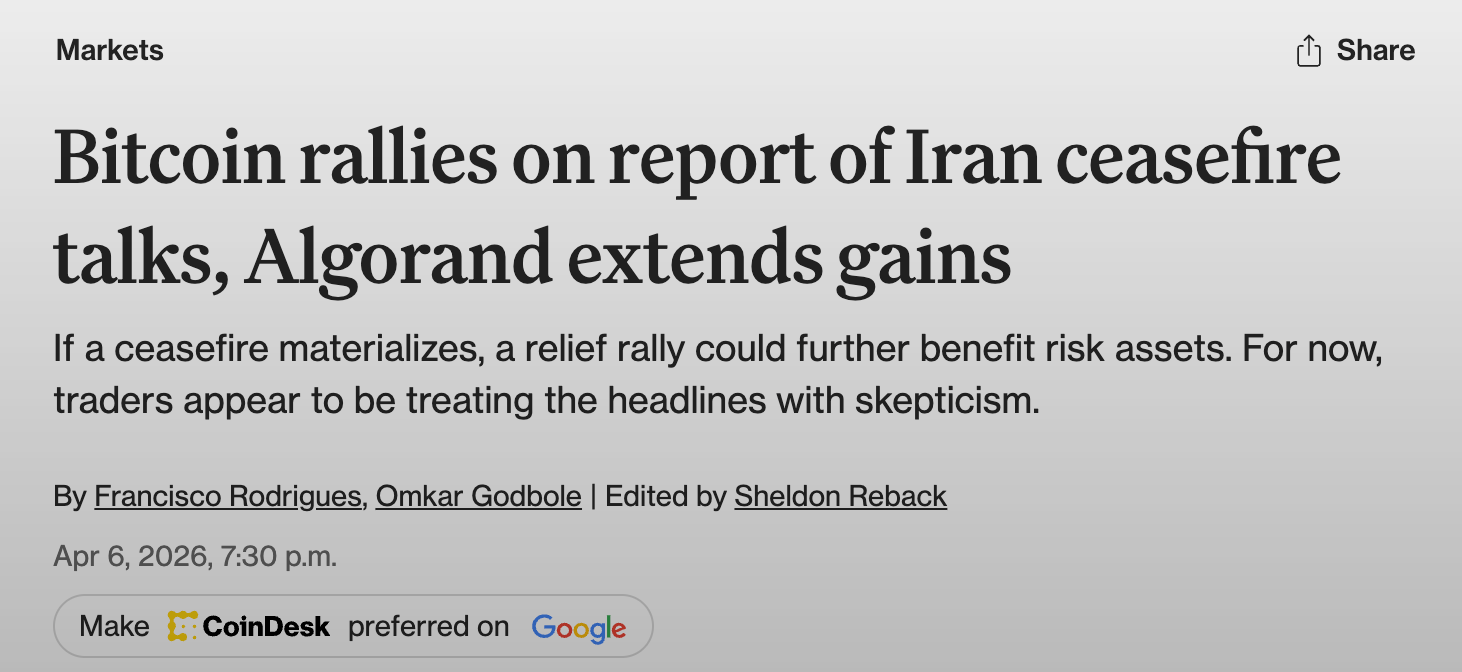 | 8 | CoinDesk: Bitcoin rallies on Iran ceasefire talks | https://www.coindesk.com/markets/2026/04/07/bitcoin-rallies-on-report-of-iran-ceasefire-talks/ |