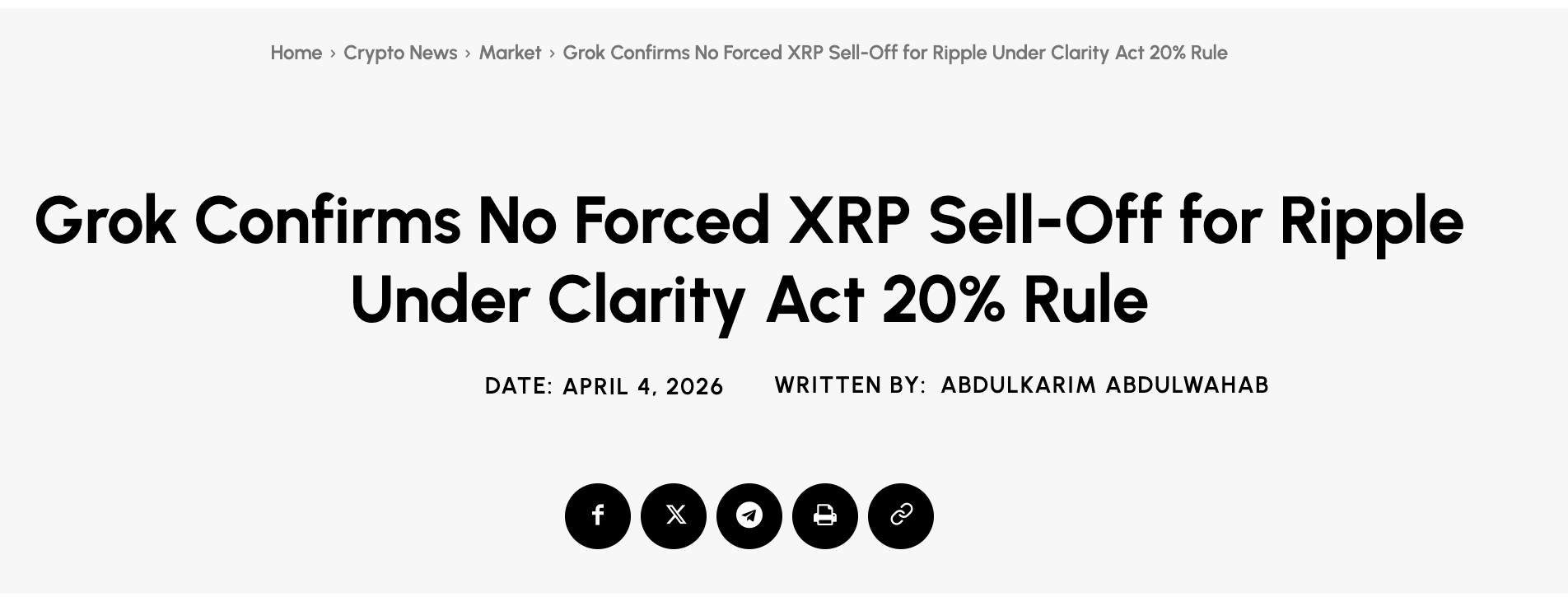 | 5 | TheCryptoBasic — Grok confirms no forced XRP sell-off under CLARITY Act 20% rule | https://thecryptobasic.com/2026/04/04/grok-confirms-no-forced-xrp-sell-off-for-ripple-under-clarity-act-20-rule/ |