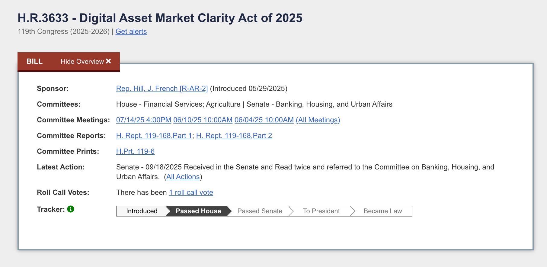 | 1 | CLARITY Act Full Text (H.R. 3633) — Congress.gov | https://www.congress.gov/bill/119th-congress/house-bill/3633/text |
