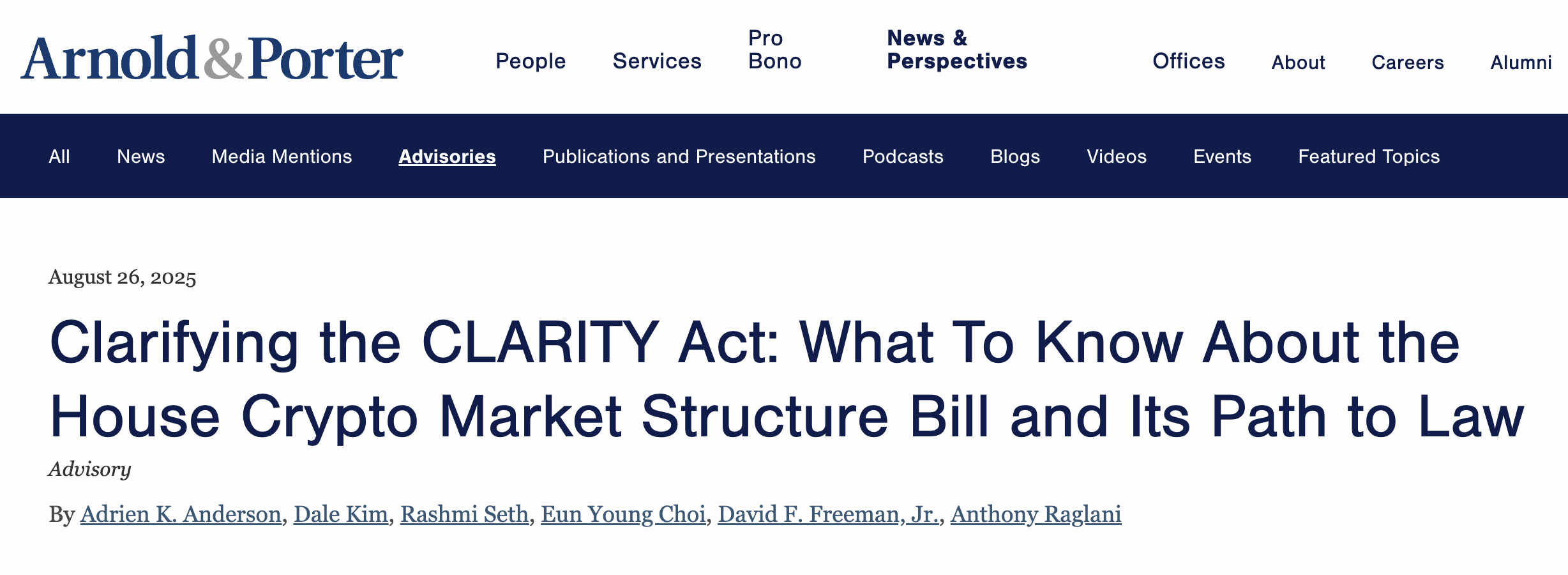| 3 | Arnold & Porter — Clarifying the CLARITY Act Advisory | https://www.arnoldporter.com/en/perspectives/advisories/2025/08/clarifying-the-clarity-act |