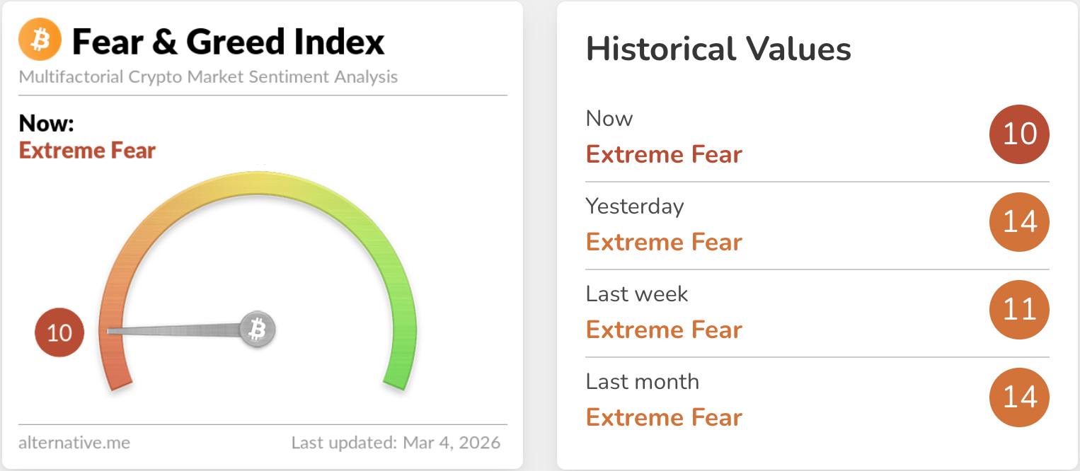 2026년 3월 4일 현재, 비트코인은 68K 부근 지지 테스트 국면에 놓였고, 시장 심리는 공포탐욕지수 10(Extreme Fear)으로 극단에 걸려 있다(Alternative.me). 동시에 트럼프 대통령이 "미국은 사실상 무제한에 가까운 무기 비축이 있으며, 전쟁을 오래 지속할 수 있다"는 취지의 발언을 했다고 Reuters가 보도하며 불확실성을 끌어올렸다.