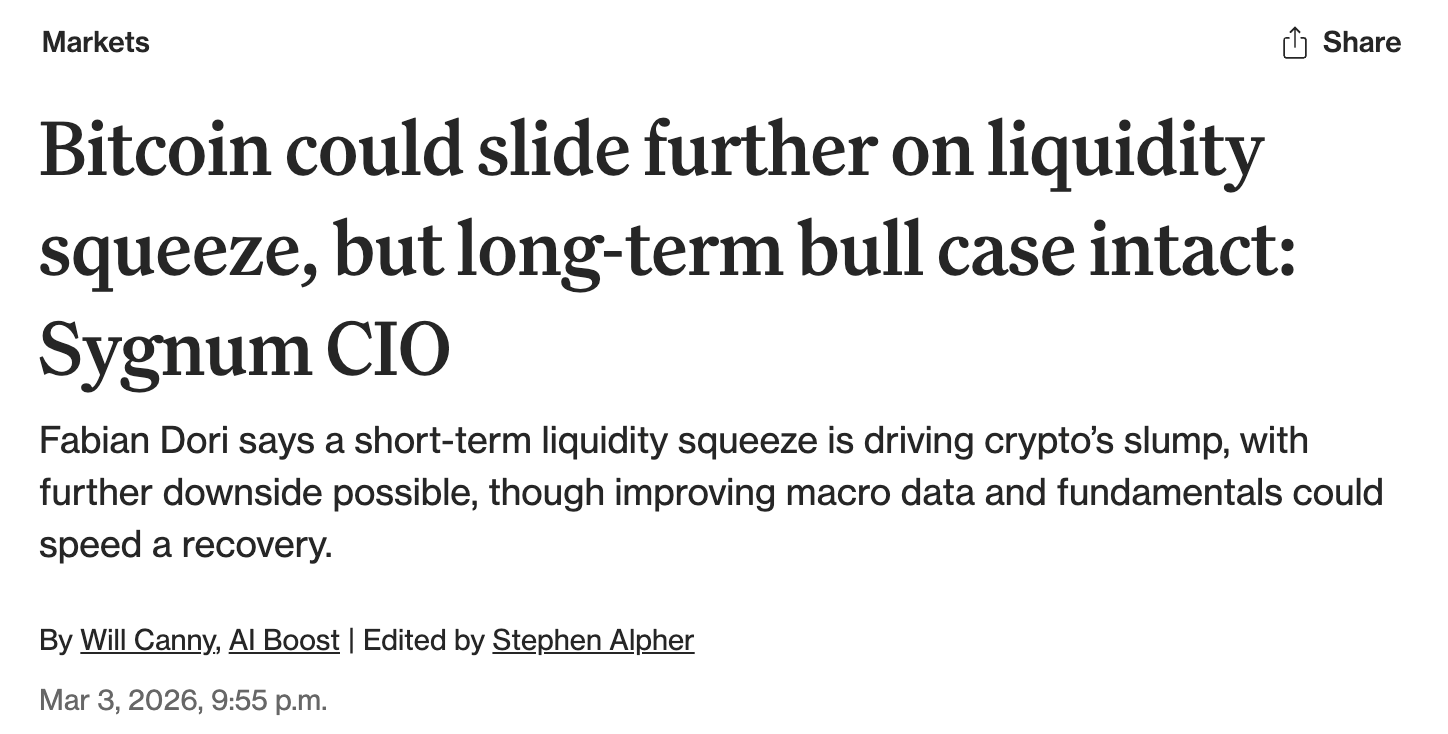 - Sygnum CIO 코멘트(유동성/변동성): CoinDesk