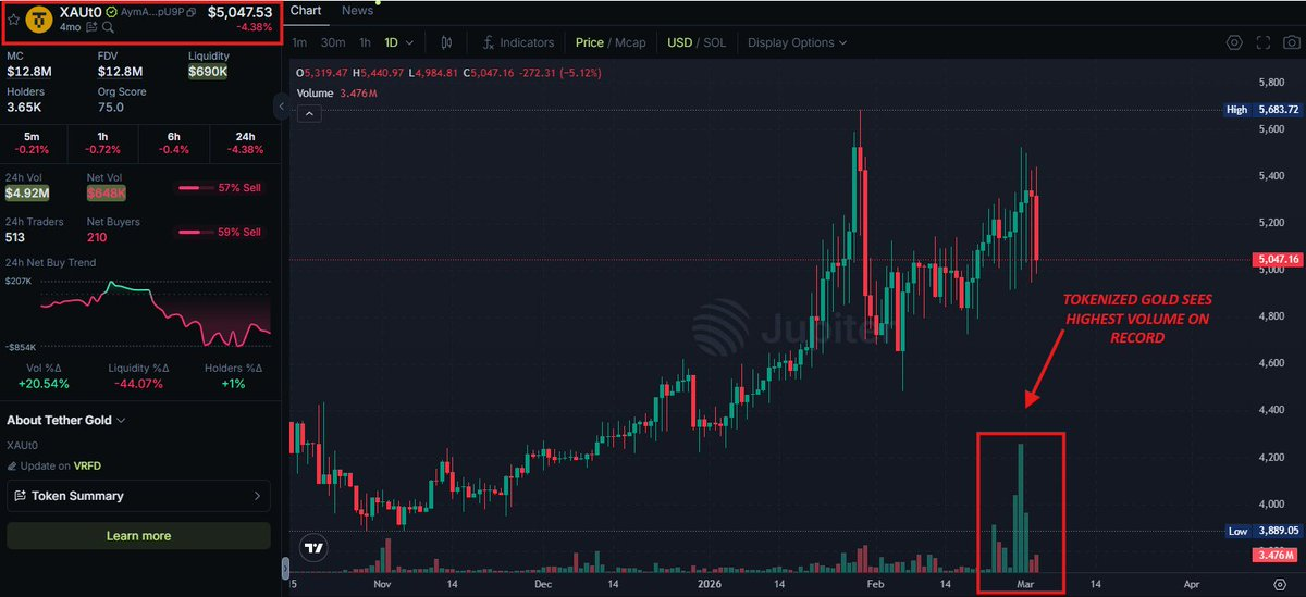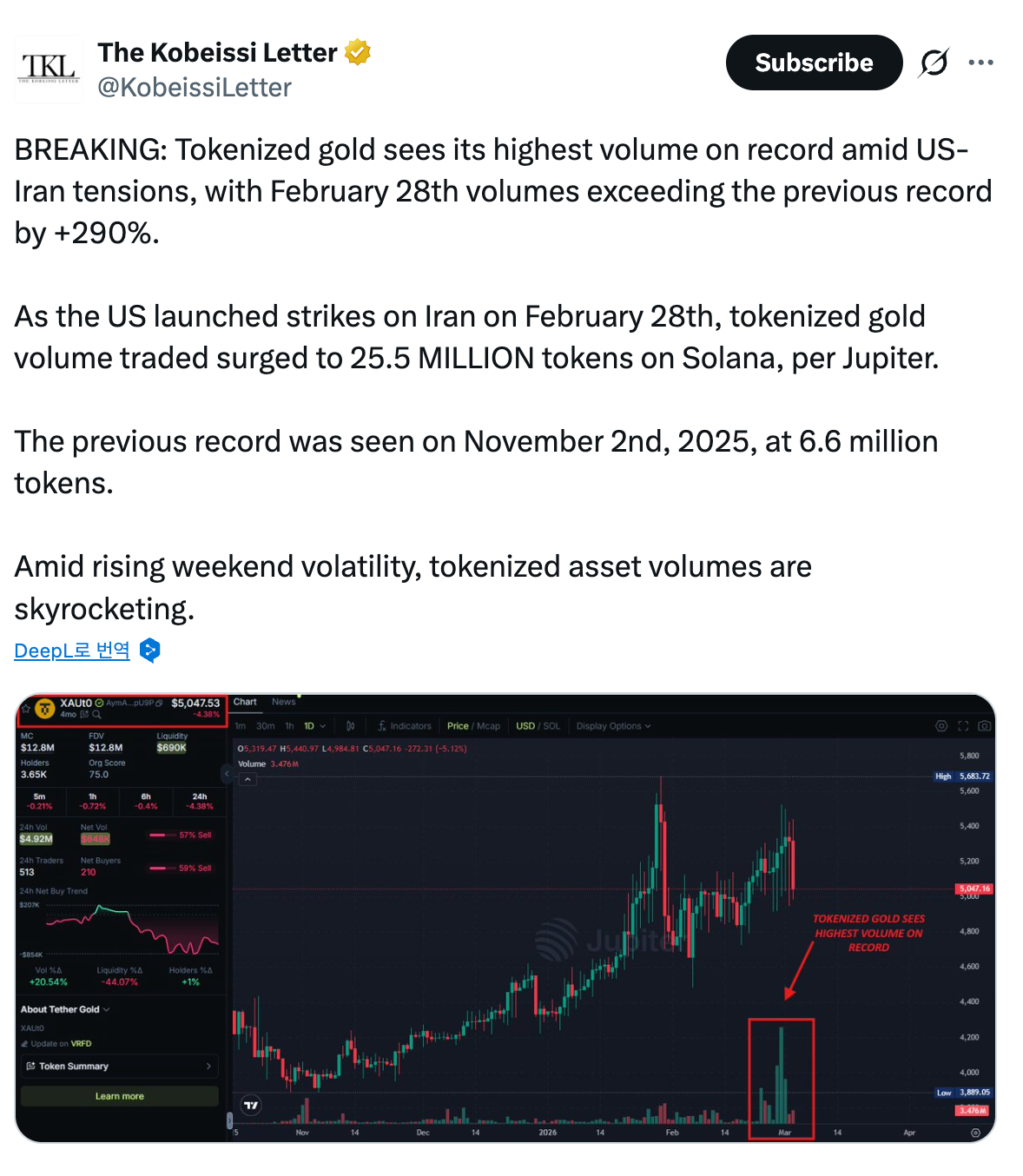 전쟁 공포가 덮친 주말, 흥미로운 데이터 포인트가 등장했다. The Kobeissi Letter는 솔라나 네트워크의 DEX Jupiter에서 '토큰화 금' 거래량이 2,550만 토큰으로 급증했으며, 이전 기록(2025년 11월 660만 토큰) 대비 290% 이상 증가했다고 전했다(X: Kobeissi Letter).