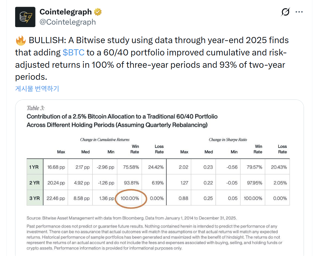 Bitwise는 전통적인 60/40 포트폴리오에 비트코인을 2.5%만 편입하고, 분기마다 리밸런싱을 수행했을 때의 효과를 분석했다(Bitwise). 기간은 2014년 1월부터 2025년 12월까지이며, 블룸버그 데이터를 기반으로 한다(Bitwise).