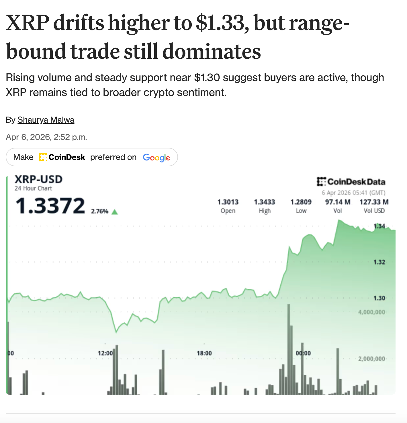 | 4 | CoinDesk: XRP drifts higher to $1.33 (4/6) | coindesk.com |